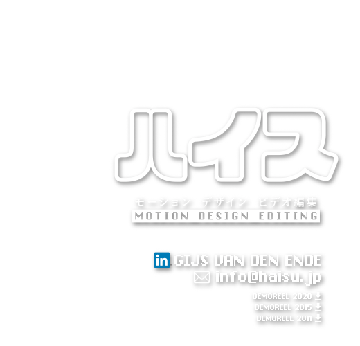 mailto:info@haisu.jp http://nl.linkedin.com/pub/gijs-van-den-ende/17/730/1a4/ mailto:info@haisu.jp Haisu_Reel2020_GijsvandenEnde.mp4 Haisu_Reel2015_GijsvandenEnde.mp4 Haisu_Reel2011_GijsvandenEnde.mp4